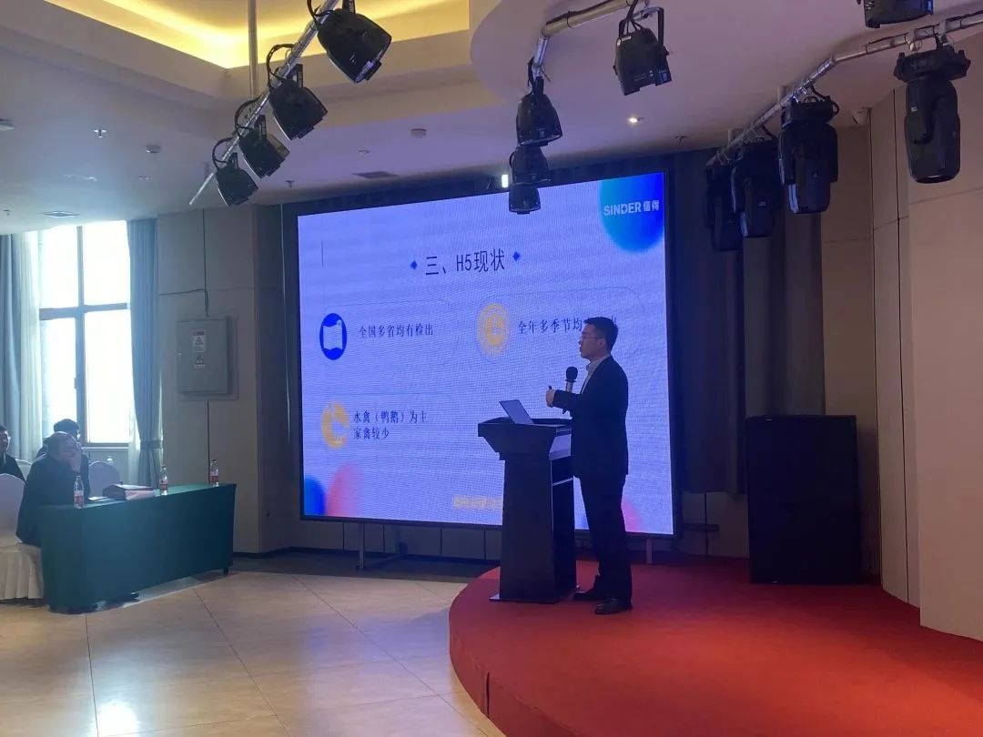 信得科技禽流感产品经理孙浩在会中分析权威机构调研数据,展示了近年来全球禽流感流行大趋势,从流行病学角度阐述新发疾病的传染特征、临床症状及危害,综合保护,免疫为先,是家禽在候鸟迁徙季应对禽流感的重要防控方式。