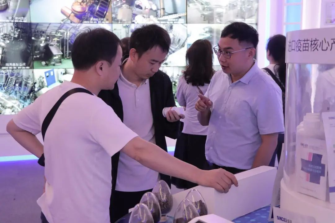 信得科技中化药研发总监李秋,信得科技中兽药事业部大区经理龚怀玉、技术经理闫先超陪同客户参观香菇多糖生产车间。在诸城工业园的一楼展厅,工作人员为客户介绍信得历史印记、产业布局,并展示了未来信得在中兽药板块的发展规划。