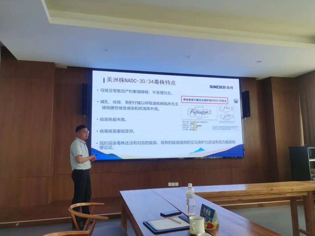 在中药防控蓝耳病的分享交流会中,龚怀玉经理为嘉宾介绍了信得的发展理念,李秋总监为大家分享了研发工艺。高级技术经理闫先超表示,蓝耳病作为家畜的重要流行疾病,新毒株层出不穷,引发的免疫抑制问题、繁殖与呼吸道综合征问题严重影响了猪群健康。随着病毒防控难度的不断增强,中药、疫苗(活、灭)免疫,再配合抗生素使用已逐渐成为猪场蓝耳防控的趋势。