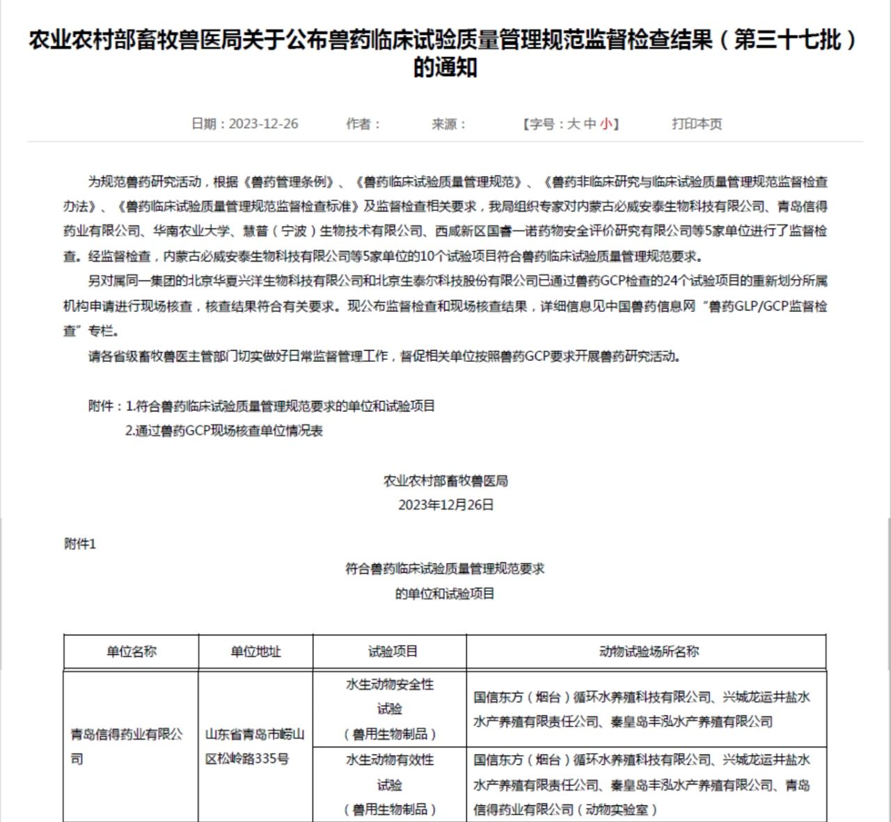 2023年12月26日,中华人民共和国农业农村部畜牧兽医局网站正式公布,青岛信得药业有限公司通过农业农村部兽药临床试验质量管理规范(兽药GCP)现场监督检查。接下来,信得将继续秉承“坚定不移地增加客户价值”的核心理念,不辜负主管部门和广大客户的期望,不断学习、完善和提升,秉承科学与伦理的原则与要求,持续推进兽药GCP的实施,确保兽药的安全性和有效性,为动保业的健康发展保驾护航!