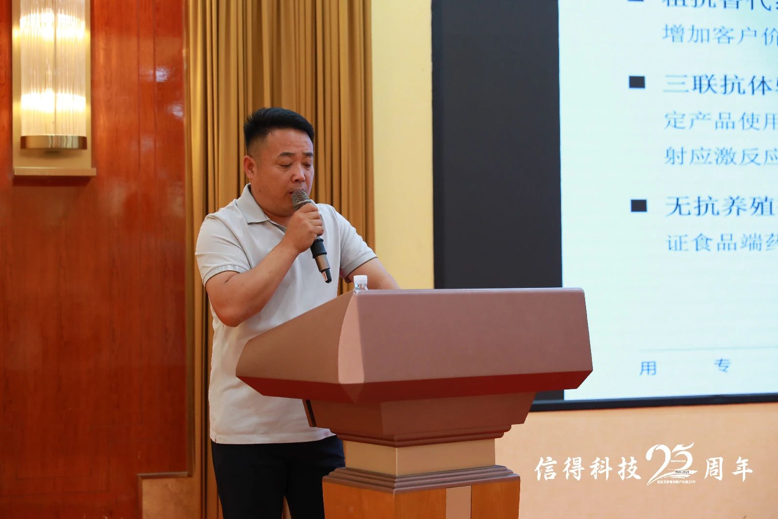 通过精准量化抗体效价,显著提升鸭肝抗体的稳定性,为养殖业提供更为有效的疾病防控方案,是信得科技产品经理吴庆海博士的追求目标。吴庆海博士综合讲解了鸭肝炎抗体及信得鸭肝炎抗体效价检测体系的新研究成果,并指出,抗体效价、毒株匹配度和超强毒是鸭肝炎防控中需要重点关注的三大问题,在养殖过程中,只有确保抗体效价达到标准,并与病毒毒株高度匹配,才能有效抵御病毒的侵袭。信得科技完成了多项鸭肝炎和呼肠孤试验,现已能够通过防控方案定制、技术服务跟踪,为客户提供完善的抗体服务体系。