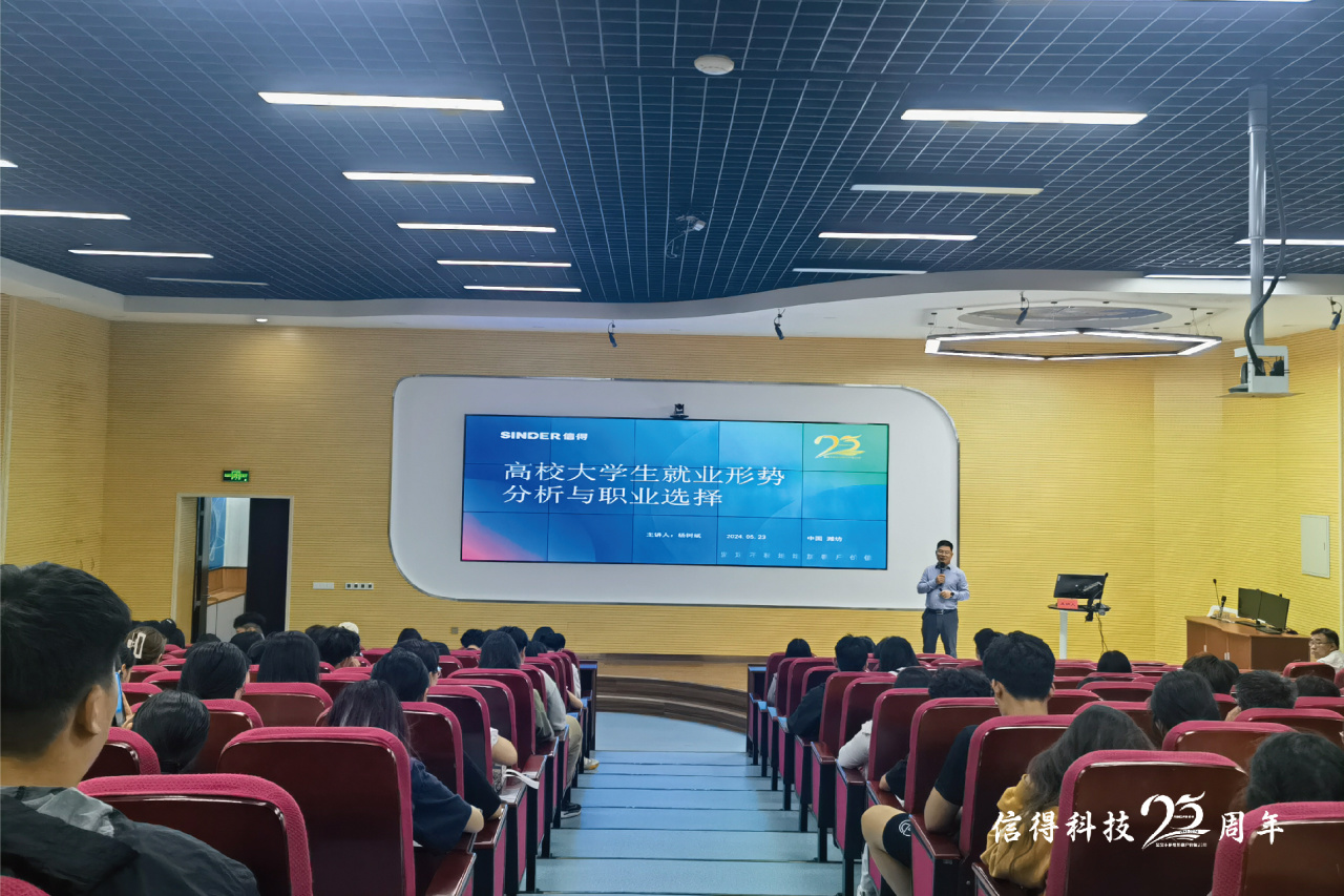座谈会后,信得科技战略人才官杨树斌先生受邀为山东畜牧兽医职业学院动物医学、动物科学相关专业的200多名学生作有关大学生就业与择业的话题分享。会上,杨树斌先生以《高校大学生就业形势分析与职业选择》为主题,从宏观经济环境、企业需求变化、高校学生就业趋势等方面入手,深刻剖析就业形势,在职业选择上给予了建议与指导,帮助同学们找到清晰的自我定位,选择更适合自己的发展方向。此外,杨总向与会学子详细介绍了山东禾源牧业有限公司、信得科技公司的发展情况和企业文化,诚邀各位优秀学子加入信得和禾源实现个人理想!
