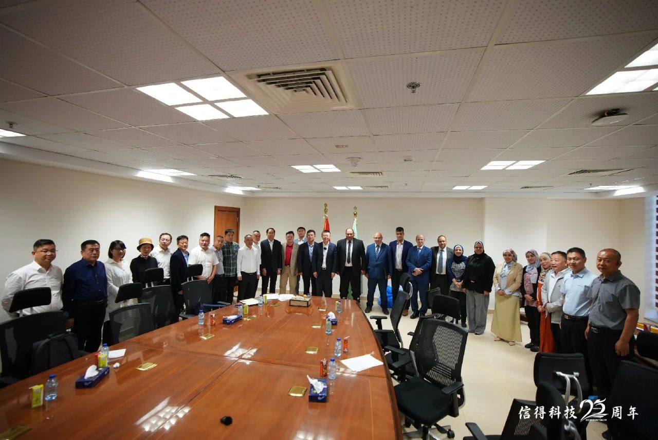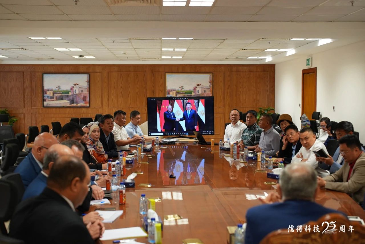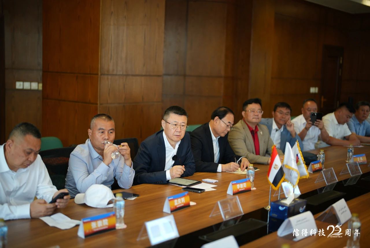 信得科技董事长李朝阳先生对埃及商会联合会领导的热情接待和中肯的投资建议、详尽的市场环境分析表示感谢,并介绍了十六家中国农牧企业的业务板块、经营状况和业务布局。李总表示,中埃两国都是世界文明古国,中埃友谊源远流长,有良好的政治、文化合作基础。中国农牧业经过几十年的发展,在种禽、养殖、屠宰、食品加工等产业链上沉淀了丰富经验和过硬技术。考察中了解到,当前埃及家禽产业发展相当于中国2005年左右水平,在座的中国企业家都经历了从不发达的经济体到相对发达经济体的发展过程,这些发展经验和养殖技术对埃及农牧产业的发展有很大价值。希望今后能与埃及商会联合会保持密切沟通联系,加强合作,促进中埃两国农牧产业的发展和进步。