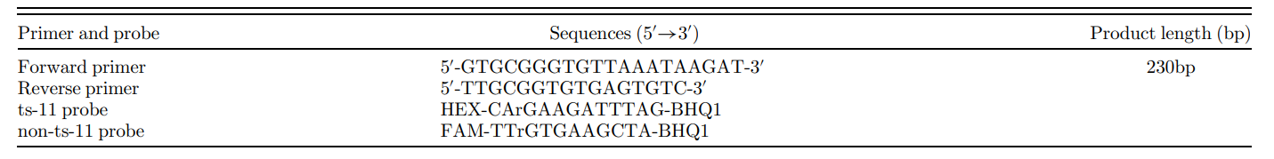 同时检测MG ts-11疫苗株和非ts-11株的Cycleave双探针荧光定量PCR方法的开发和应用
