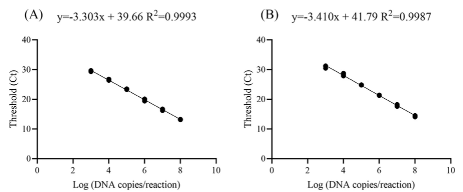 图1. Cycleave qPCR标准曲线。ts-11株质粒pts-11从2.43×103倍比稀释到2.43×108拷贝/mL(A);非ts-11株质粒pnon-ts-11从1.65×103倍比稀释到1.65×108拷贝/mL(B)。