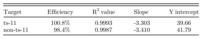 用微量分光光度计测定pts-11和pnon-ts-11重组质粒的浓度,并计算各自的拷贝数。然后将质粒在无菌水中进行10倍倍比稀释(108~103),作为cycleave qPCR的模板。每个稀释度重复3次,建立标准曲线。反应体系和程序同上,利用软件计算标准曲线参数,包括效率、斜率和R2。