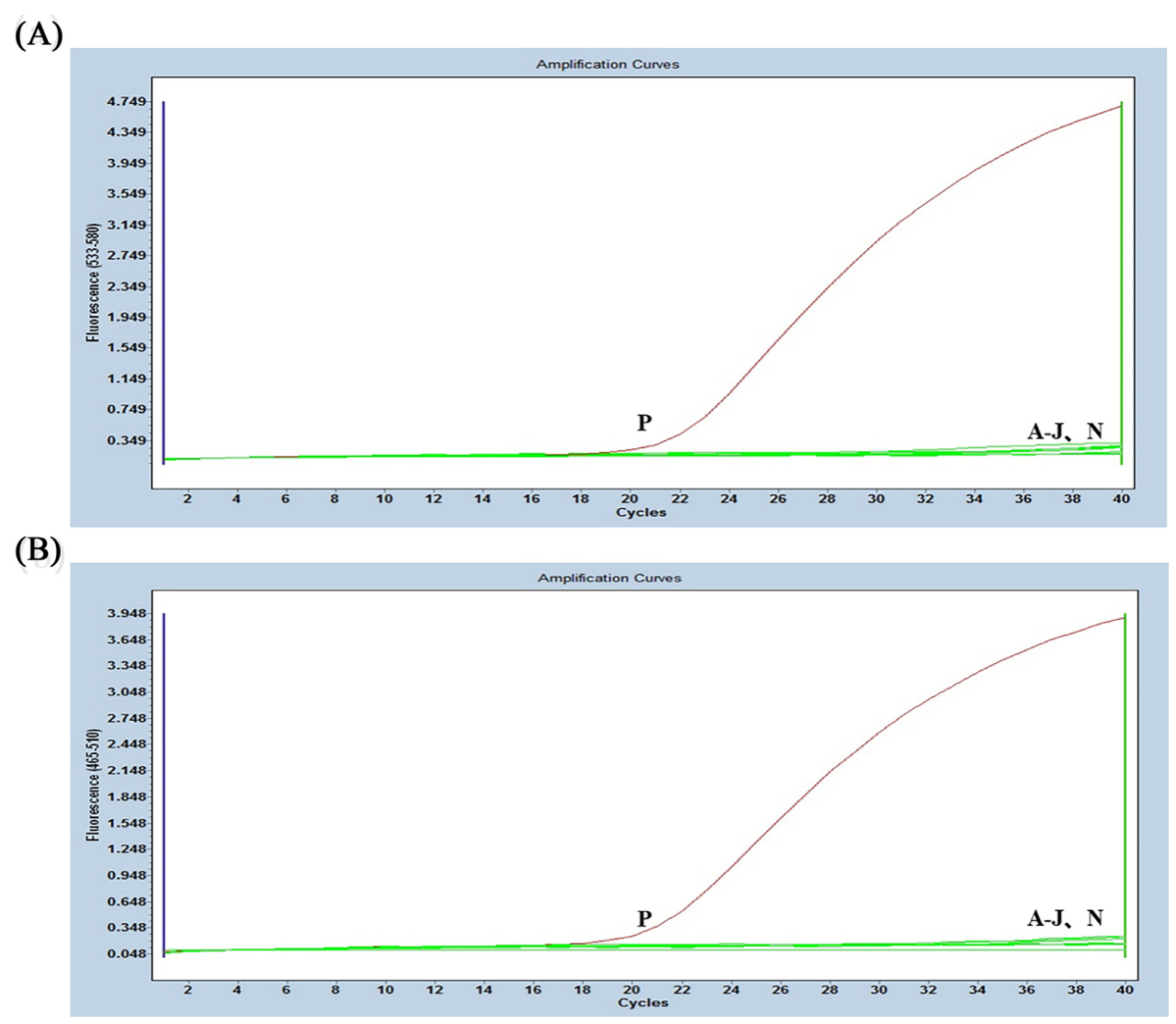 图2. Cycleave qPCR特异性评估。ts-11疫苗株(A);非ts-11株(B)。P:阳性对照;A:AIV;B:IBV;C:NDV;D:FAdV;E:ILTV;F:IBDV;G:CAV;H:MDV;I:MS;J:ORT;N:阴性对照。