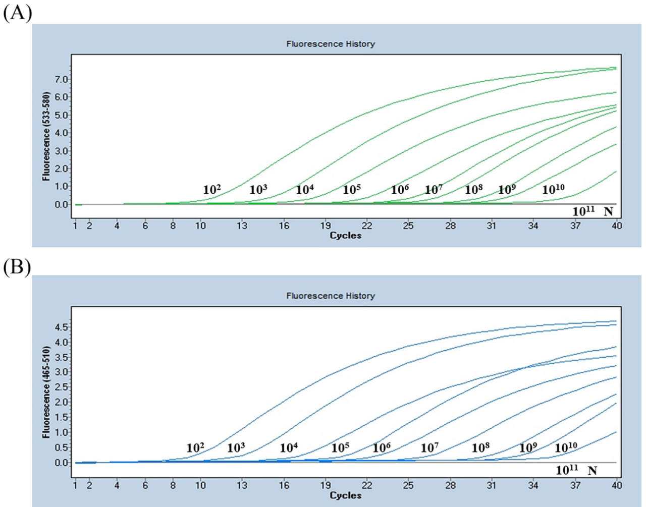 图3. Cycleave qPCR敏感性评估。ts-11株质粒pts-11从102倍比稀释到1010(A);非ts-11株质粒pnon-ts-11从102倍比稀释到1010(B)。N:阴性对照。
