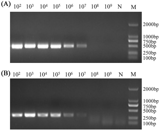 图4. 普通PCR检测ts-11株和非ts-11株电泳图。ts-11株质粒pts-11从102倍比稀释到1010(A);非ts-11株质粒pnon-ts-11从102倍比稀释到1010(B)。N:阴性对照;M:DNA标准。