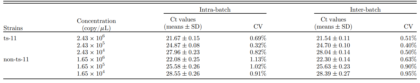 为评价cycleave qPCR的重复性和稳定性,进行批内和批间重复性试验,所有cycleave qPCR均重复3次,计算Ct和CV的平均值。结果显示,ts-11株批内重复性CV为0.32%~0.82%,非ts-11株批内重复性CV为0.91%~1.13%。此外,ts-11株的批间重复性CV为0.40%~0.51%,非ts-11株的批间重复性CV值为0.63%~0.95%(表3)。