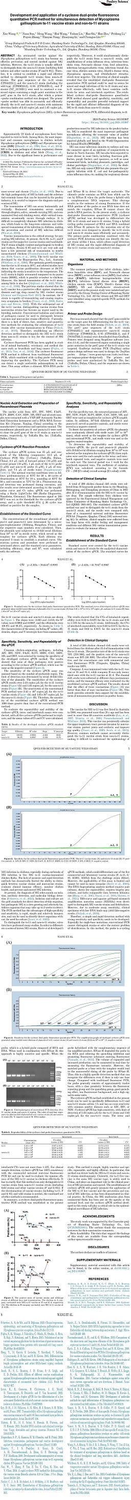 摘要:鸡败血支原体(MG)ts-11活疫苗已成为预防和控制MG感染的有效方法。然而,ts-11株通常难以与非ts-11株,包括野毒株和其他疫苗株(F和6/85)进行区分。因此,建立一种快速有效的方法来区分ts-11株和非ts-11株至关重要。根据ts-11株pot C基因中存在一个单点突变的保守区域,我们设计一对引物及鉴别疫苗毒和野毒的两条探针。该方法能够准确、高效地鉴别ts-11和非ts-11株,最低检测限分别为2.43拷贝/μL和1.6拷贝/μL。此外,该方法也具有良好的特异性,禽流感病毒、传染性支气管炎病毒、新城疫病毒、禽腺病毒、传染性喉气管炎病毒、传染性法氏囊病病毒、鸡贫血病毒、马立克氏病病毒、滑液囊支原体和鼻气管鸟杆菌检测结果均为阴性。临床样品检测结果表明,该方法可有效进行ts-11和非ts-11株的混合感染或单一感染的检测区分,而且批内和批间变异系数较低。本研究建立的cycleave双探针荧光定量PCR方法具有良好的特异性、敏感性和重复性,为MG ts-11和非ts-11株的快速高效鉴别诊断提供了有力的技术支撑。