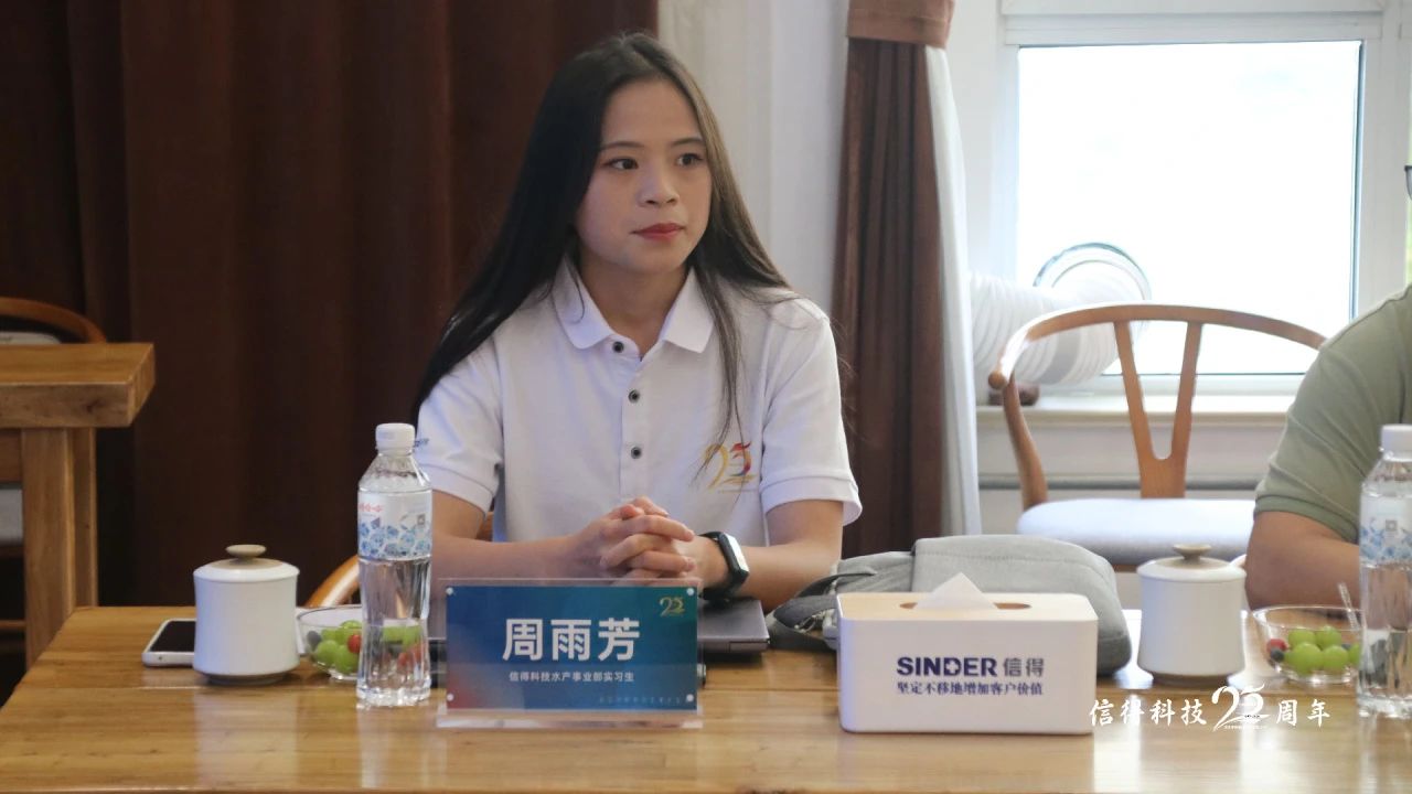 会上,信得优秀实习生代表周雨芳分享了她在信得科技水产事业部的实习经历和成长感悟。她表示,在信得实习期间,不仅学到专业知识和技能,还锻炼了自己的实践能力和团队协作精神,收获累累的硕果。