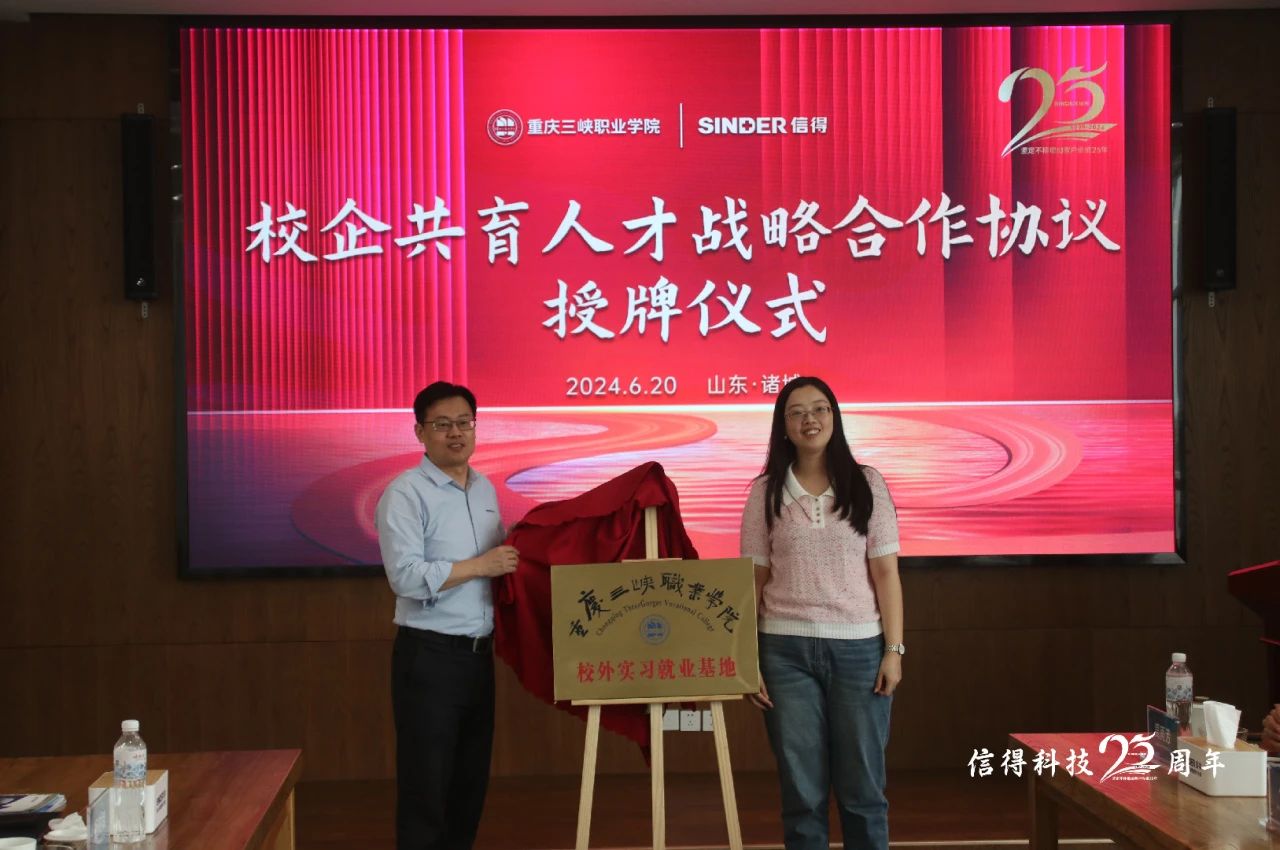 经过充分沟通交流,重庆三峡职业学院领导对信得发展情况有了充分了解,达成深度合作。会上,重庆三峡职业学院李书记与信得科技常务副总裁董涛先生共同为信得科技“校外就业实习基地”揭牌,双方合作进入新阶段。