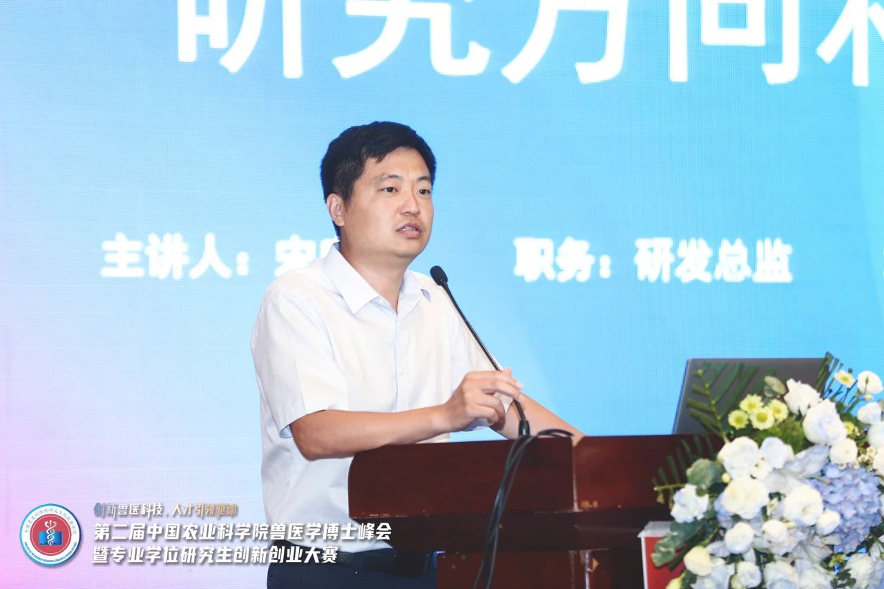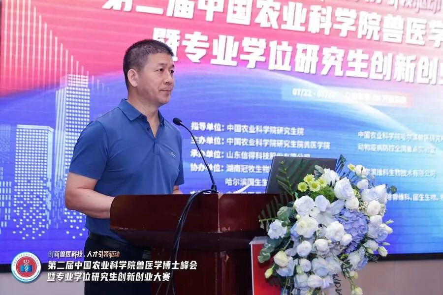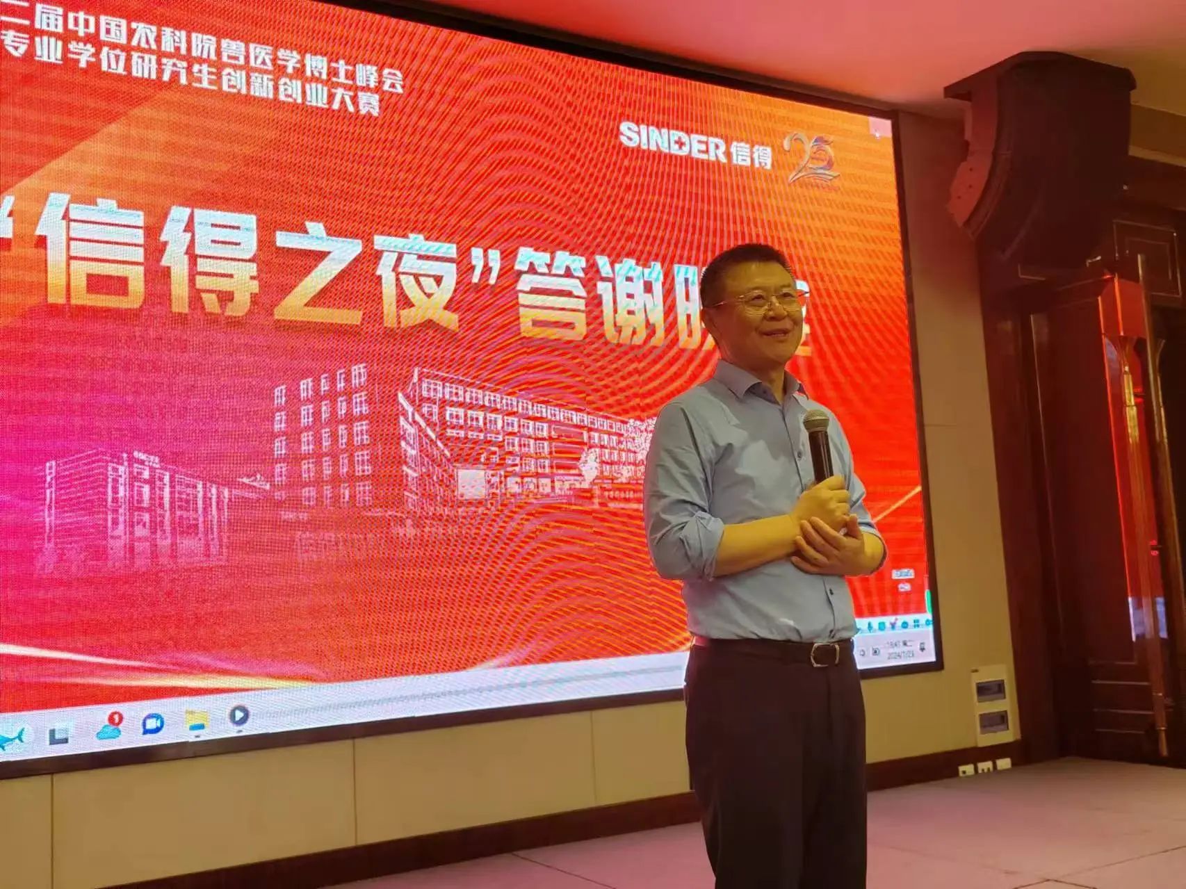 信得科技总裁李朝阳先生在答谢晚宴中发表祝词,恭贺第二届中国农科院兽医学博士峰会暨专业学位研究生创新创业大赛圆满落幕。