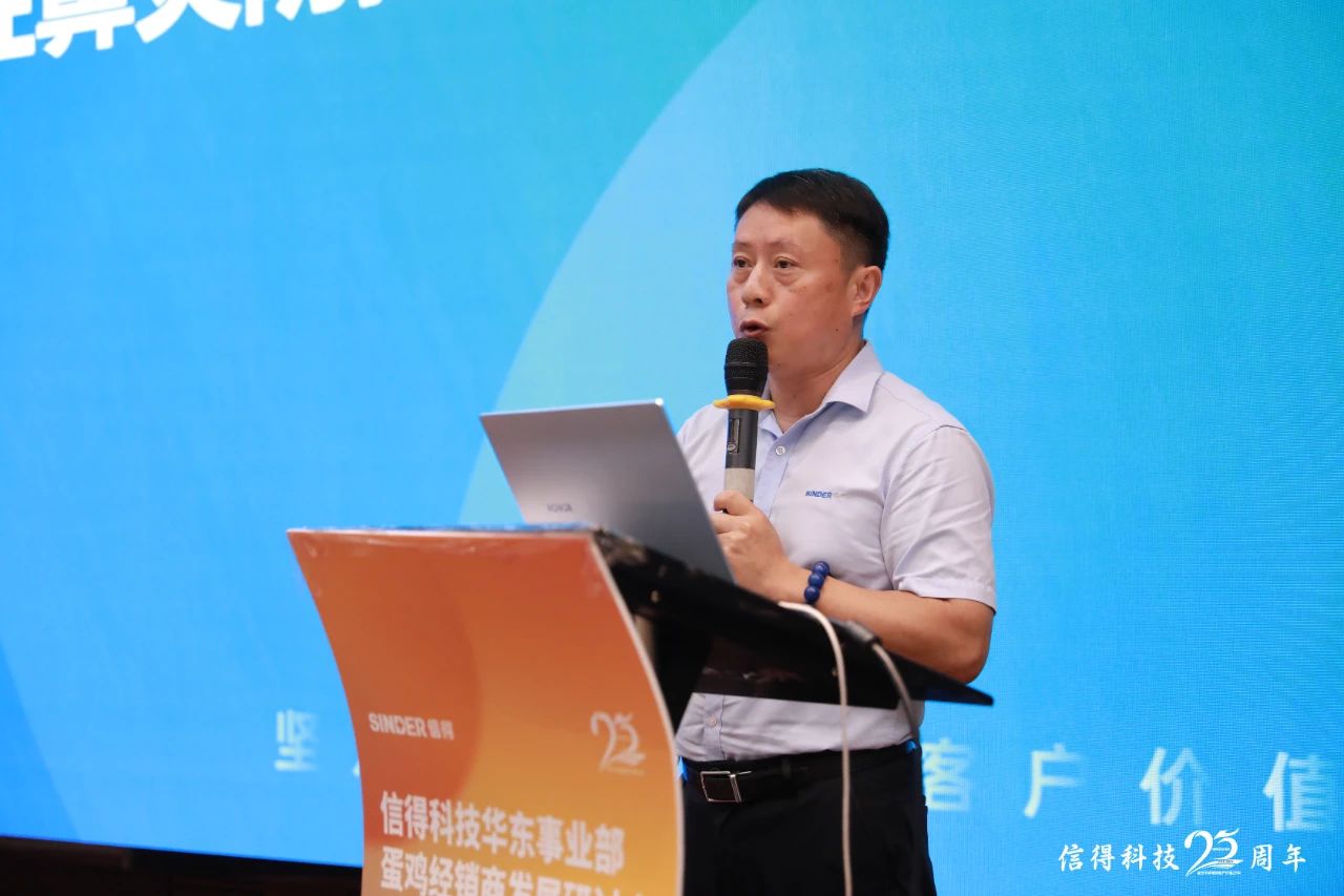 信得科技产品经理宋山亮在会议上提出针对夏季蛋鸡养殖的中药防控方案。面对高温高湿环境带来的挑战,该方案包括使用藿香正气口服液防暑抗应激,以及“肝净方案”强肝排毒,稳产高产。此外,宋山亮经理还介绍了双黄连口服液、麻杏石甘口服液和清瘟解毒口服液等中药产品在提升蛋鸡的健康水平和产蛋性能中的作用。