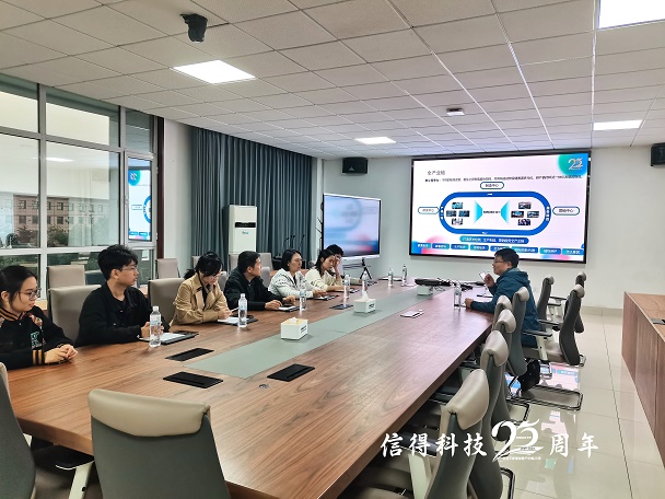 信得科技战略人才官杨树斌、招聘管理部宗亚娜出席接待并与到访校领导、师生座谈交流。