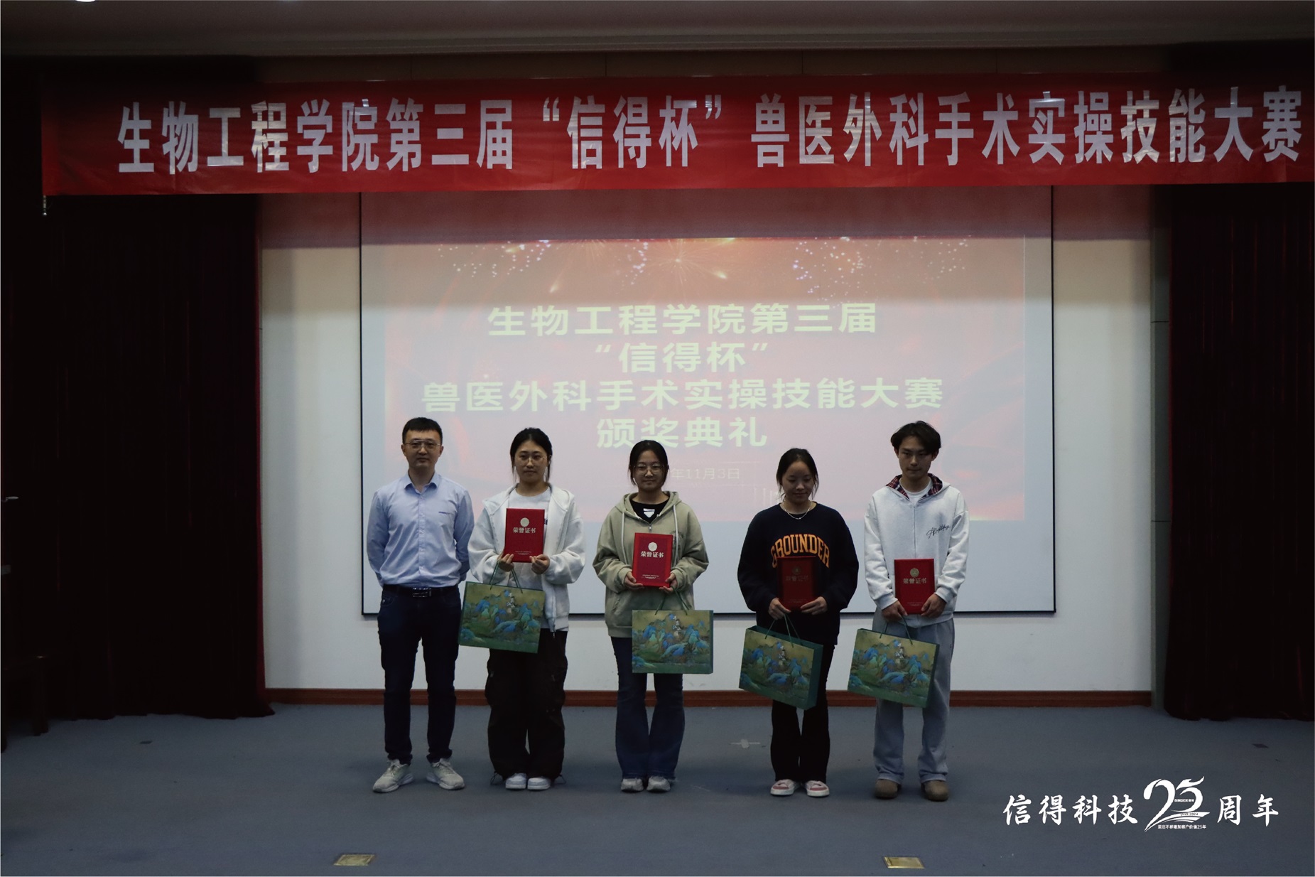 11 月 3 日下午,第三届 “信得杯” 兽医外科手术实操技能大赛在青岛农业大学海都学院动物疾控中心圆满举办。本次大赛由生物工程学院副院长张伟主持,党总支副书记管晓庆、团总支书记李琦、动物医学专业教师庞天津、张可心、陈栋梁、辅导员孙一斐及信得科技检测中心检测组长朱浩出席,2022 级动物医学专业学生踊跃参与。