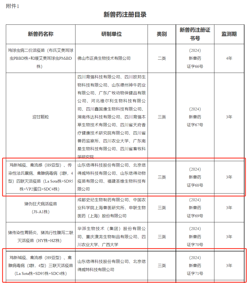 经审查,米兰官方网页版、北京信得威特科技有限公司、山东信得动物疫苗有限公司研制的鸡新城疫、禽流感(H9亚型)、传染性法氏囊病、禽腺病毒病(I群,4型)四联灭活疫苗(LaSota株+SD95株+VP2蛋白+SDC4株)和鸡新城疫、禽流感(H9亚型)、禽腺病毒病(I群,4型)三联灭活疫苗(La Sota株+SD95株+SDC4株)获批三类新兽药证书。