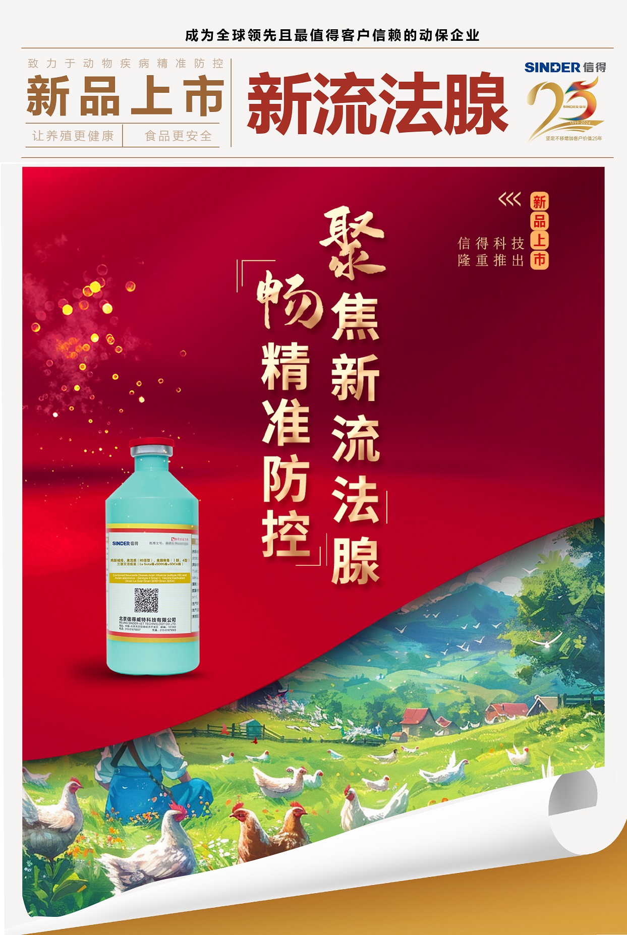 新流法腺疫苗由信得科技历时多年研发,可有效防控当前流行的新城疫、H9亚型禽流感、腺病毒和法氏囊病,此产品采用高密度发酵工艺、优选进口佐剂、新型免疫增强剂等生产工艺,具有一针四防、高浓缩、高效价,高保护,应激反应小等特点。信得新流法腺获批三类新兽药证书将为动物疾病的精准防控,客户养殖效益的提升提供强力支持。