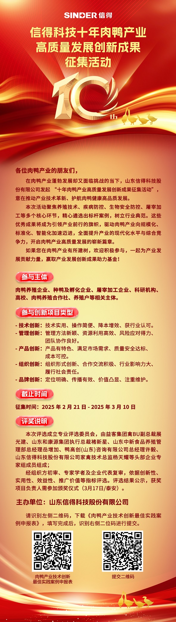 近年来,中国肉鸭产业发展跌宕起伏,机遇与挑战并存。国内市场对鸭肉需求稳步增长,推动养殖规模扩大,集约化、规模化养殖模式成为主流,养殖区域分布更加集中。肉鸭产业面临诸多挑战,疾病防控难题突出,传统疫病周期性肆虐,新型疾病发病机理复杂、传播速度快,养殖密度、环境变化及种鸭品质等因素加剧了疾病的爆发频率与危害程度。为深入探讨肉鸭行业的增长策略,剖析产业的现状与未来走向,持续推进肉鸭产业的高质量发展。米兰官方网页版定于3月17日在泰安举办第十届中国肉鸭产业健康发展与疾病防控高峰论坛。本次会议将重点分享这十年来行业创新支撑高质量发展的最佳实践,激励更多从业者投身创新发展,共同推进行业高质量、有效率地增长。为进一步推动肉鸭产业技术创新,提升产业发展质量,本次大会特地组织十年肉鸭产业高质量发展创新成果征集活动。