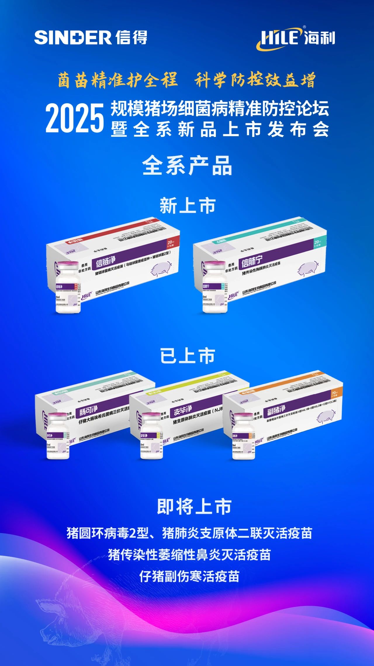 信得科技通过多年的技术沉淀和持续研发投入,现已构建起覆盖细菌病防控的全系产品线,包括:2个新上市的产品(猪链球菌二价灭活疫苗、猪传染性胸膜肺炎灭活疫苗);3个已经上市的产品(副猪嗜血杆菌病三价灭活疫苗、仔猪大肠埃希氏菌病三价灭活疫苗、猪支原体肺炎灭活疫苗);3个即将上市的产品(猪传染性萎缩性鼻炎灭活疫苗、仔猪副伤寒活疫苗、猪圆环病毒2型猪肺炎支原体二联灭活疫苗)