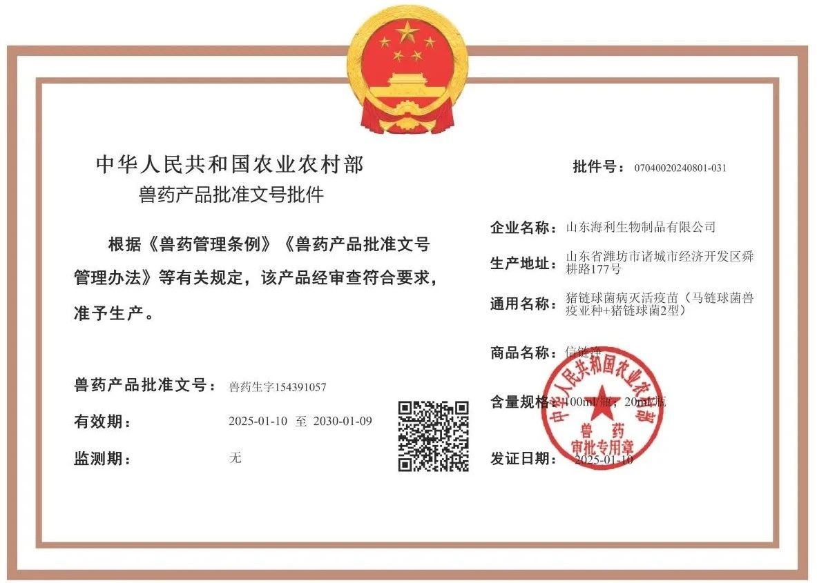 近日,信得科技获得猪传染性胸膜肺炎二价灭活疫苗、猪链球菌病灭活疫苗 2 个兽药产品批准文号。
