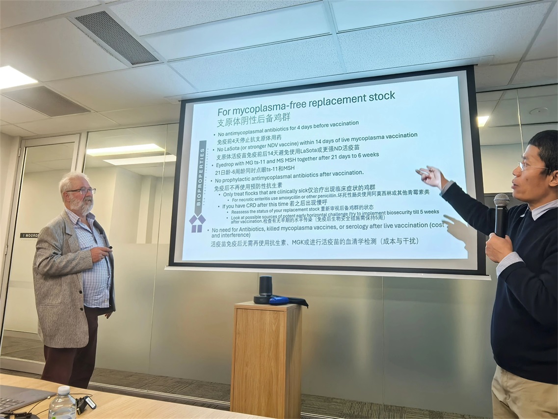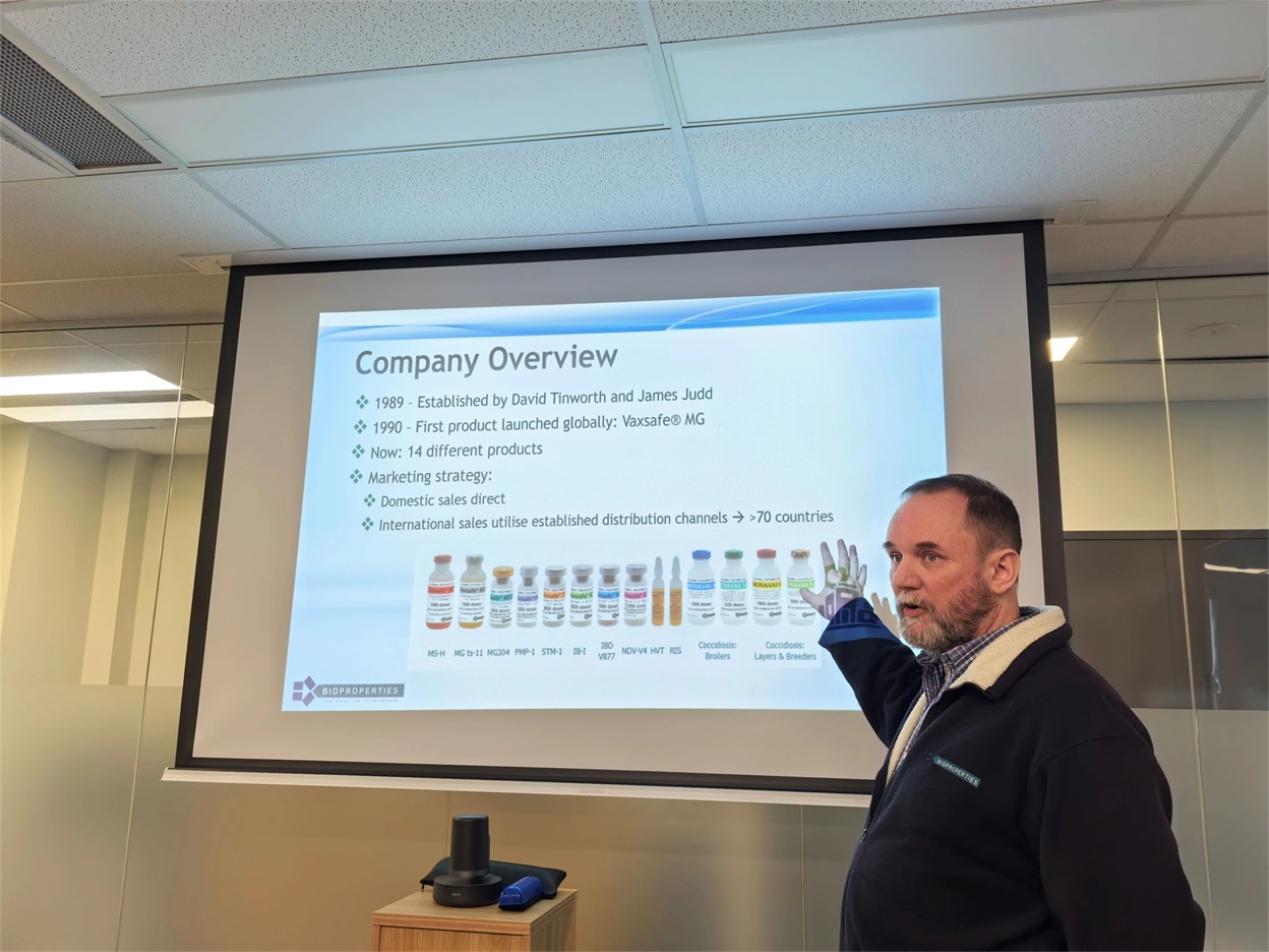 澳大利亚生物资源公司是澳大利亚领先的新型疫苗研究公司,GMP制造商,以及向密集养殖的食品动物工业提供活疫苗的全球供应商。为了让中国农牧行业同仁深入了解当前全球动物疾病流行趋势和先进的疫病防控措施,此次活动由信得科技执行副总裁崔广超先生带队,与诸位中国农牧行业精英走进澳大利亚生物资源公司参观交流。澳大利亚生物资源公司执行主席安东尼(Anthony)、澳大利亚生物资源公司悉尼工厂负责人马修(Matthew Heslop)、墨尔本大学兽医免疫学博士,副教授皮特?斯考特博士(Dr Peter C. Scott )、墨尔本大学格雷·布朗宁教授、澳大利亚生物资源公司全球技术服务总监克里斯博士(Chris)、信得科技支原体产品经理刘丰欣等专家学者分别向中国农牧业精英介绍了全球支原体活苗使用情况、澳洲蛋鸡历史、家禽流行疾病及支原体疫苗在澳洲的使用情况,遏制耐药行动:清除家禽业对抗生素的依赖,抗生素与免疫的效果与成本比较等内容,为中国农牧业精英家禽疾病防控开阔了视野,拓宽了思路。
