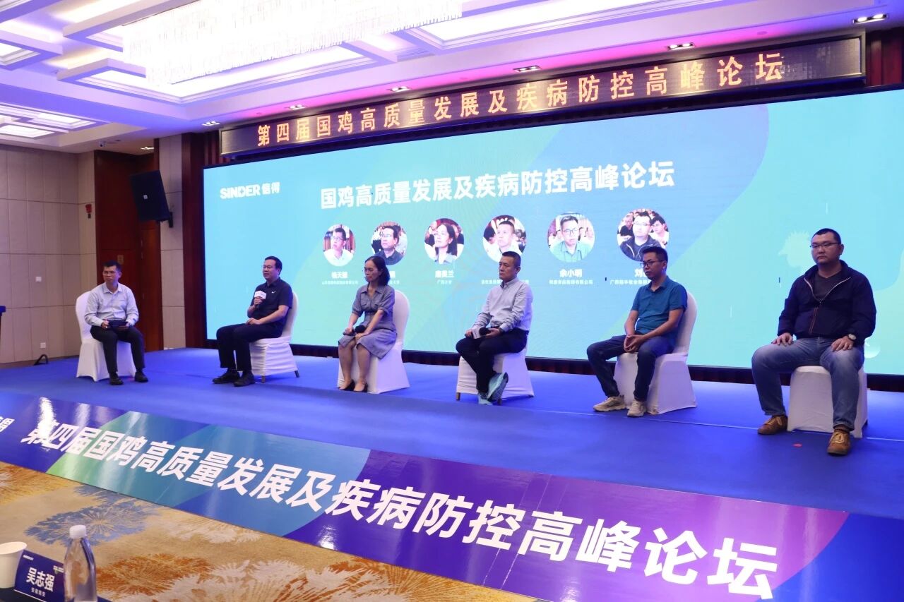 在杨天耀博士主持的高峰论坛环节,山东农业大学赵鹏教授,广西大学磨美兰教授、温氏食品集团鸡业三部副总裁张齐、和盛食品集团广西分公司负责人余小明、广西园丰集团技术负责人刘岳,围绕国鸡产业高质量发展路径、养殖技术升级与疫病系统防控,生物安全等议题展开研讨,为行业同仁精准防控动物疫病,高效发展提供思路与建议。