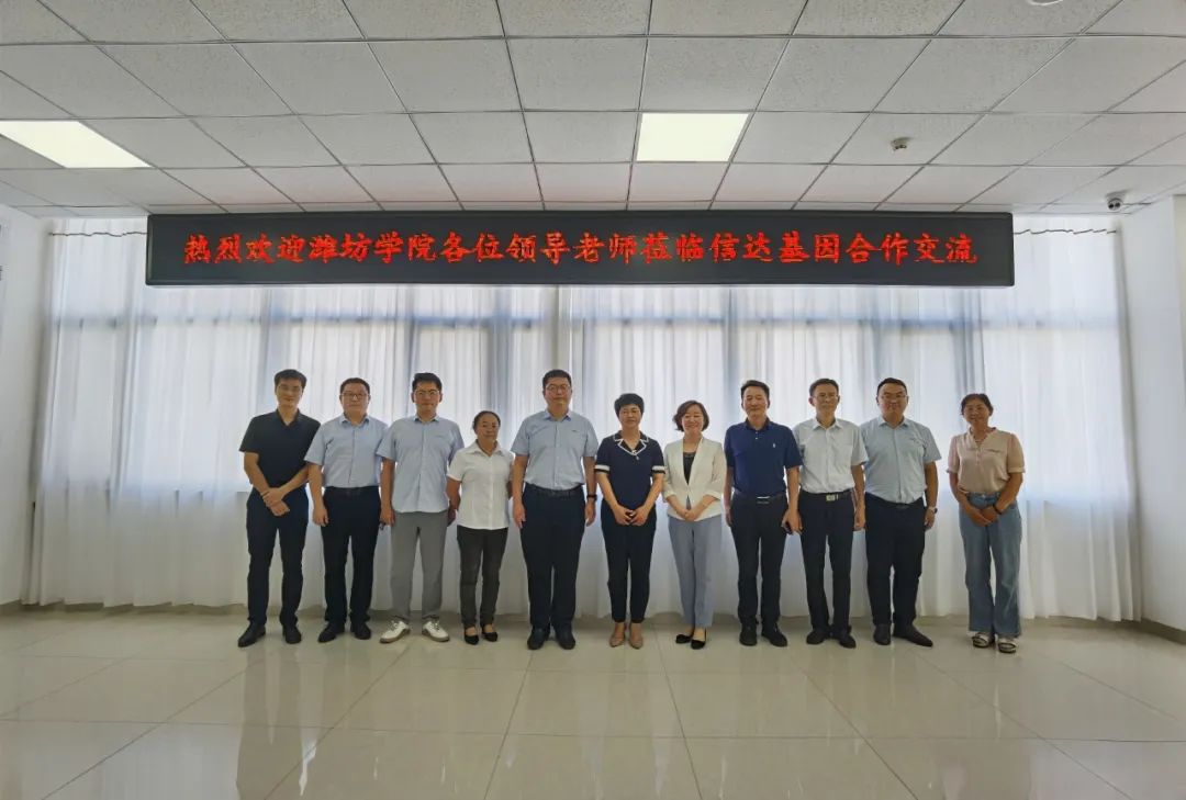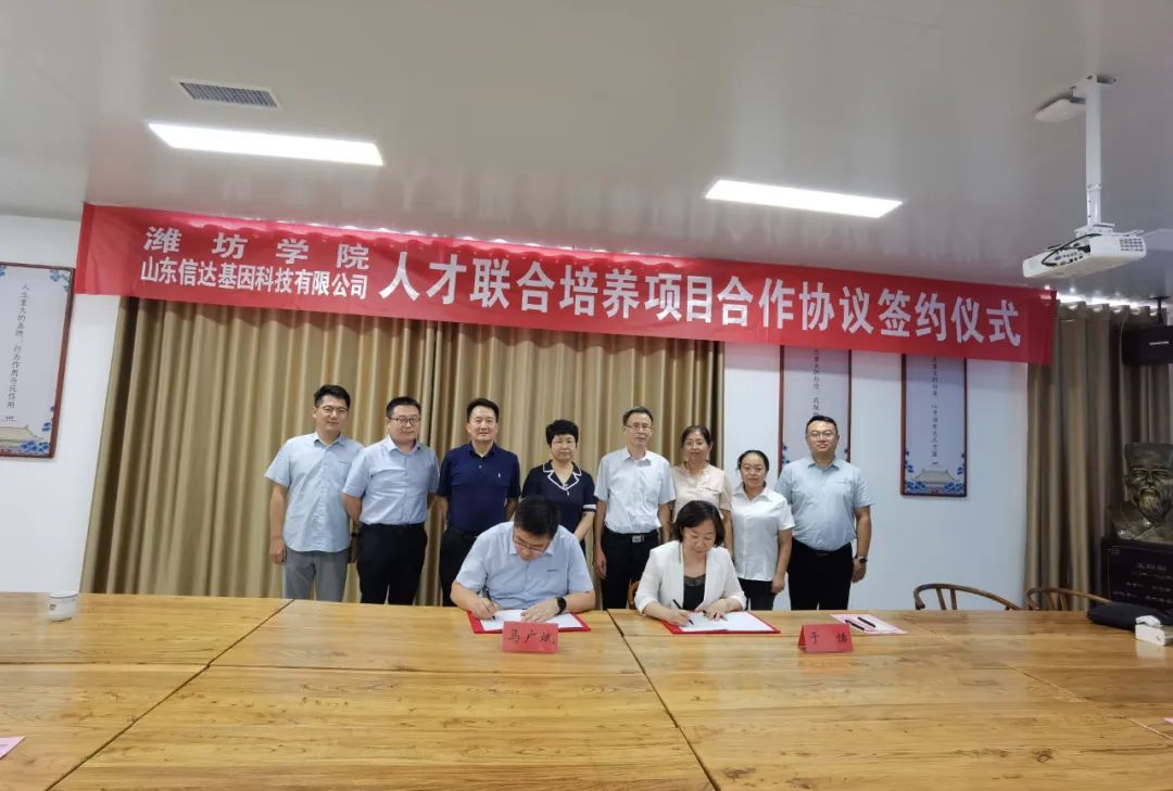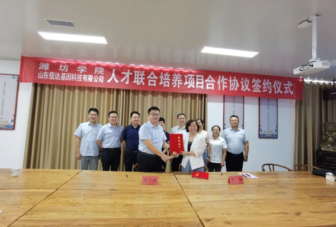2022年9月2日下午,潍坊学院与山东信达基因科技有限公司(以下简称信达基因)在信达基因五楼培训室签署人才联合培养项目合作协议。潍坊学院生物与海洋学院党总支书记于恬、副书记黄本玉、生物技术学科负责人刘春香、高峰涛博士、席丹博士,诸城市畜牧业发展中心党组书记、主任徐兰芳、诸城市科技局副局长荆晓丽、信得科技副总裁兼信达基因董事长马广斌、山东诸子生物科技有限公司董事长宋桂才、信达基因副总经理王方山博士、研发部经理赵永伟参加签约仪式。仪式由马广斌副总裁主持。