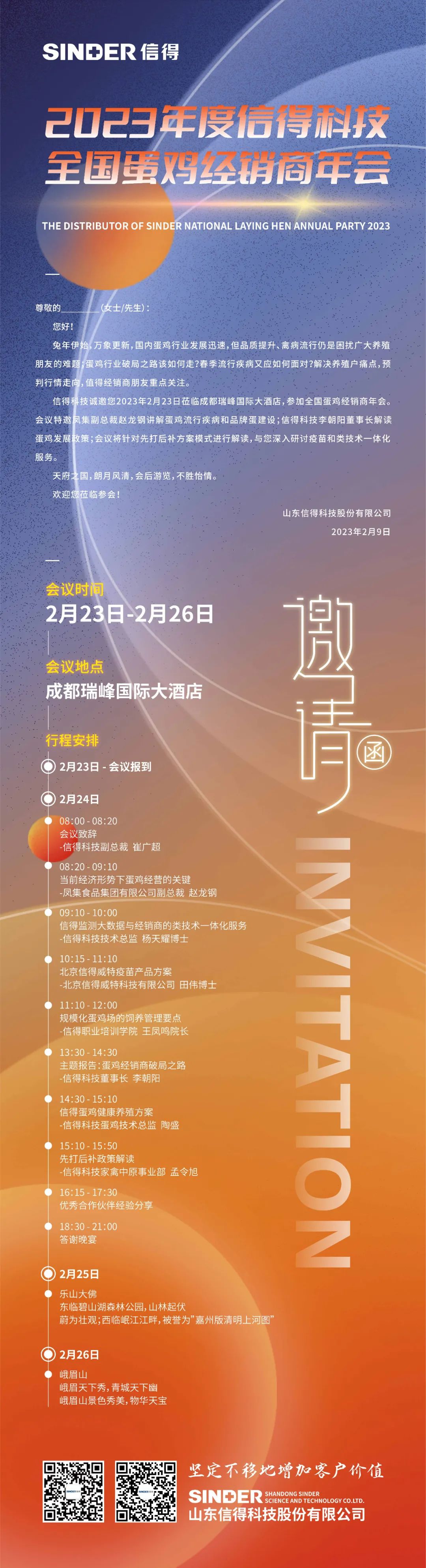 草长莺飞,仲春伊始,万物焕然,2023年2月24日,信得科技主办的蛋鸡经销商年会将于四川成都隆重开启。