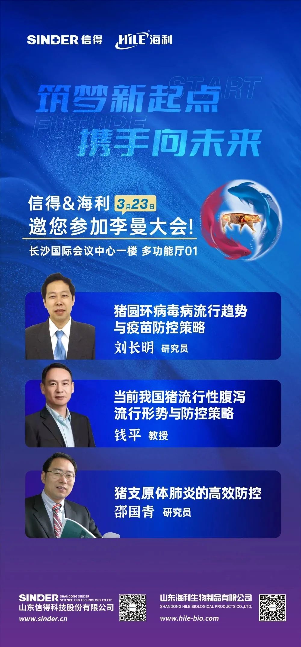 李曼大会召开当天信得&海利将在长沙国际会议中心大厅一楼联合举办主题会,邀请刘长明研究员、邵国青研究员、钱平教授等专家学者与参会嘉宾共话当前我国猪圆环、支原体肺炎及流行性腹泻等行业关键话题,思维碰撞,研讨交流!