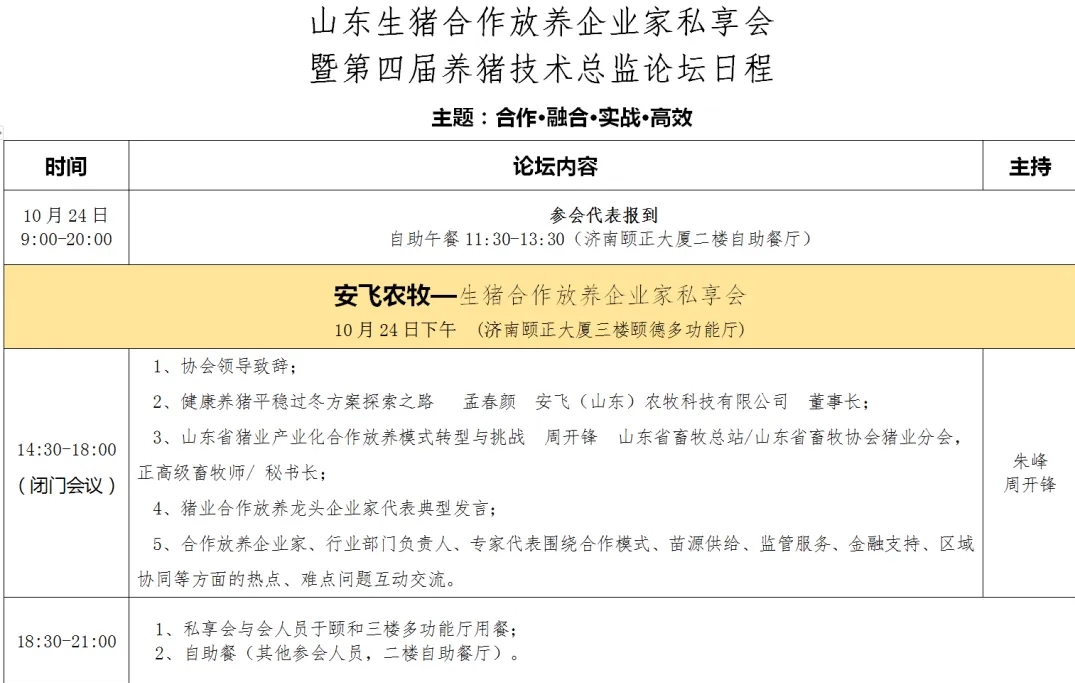 1、合作放养企业家私享会(特邀、闭门)。采用私享会形式,特邀我省从事生猪合作放养的TOP30企业代表,就当前生猪放养的合作模式、苗源供给、金融支持、区域拓展现状、问题和挑战展开交流,并就未来合作种苗基地建设、产业发展趋势及产业相关热点、卡点问题展开探讨。