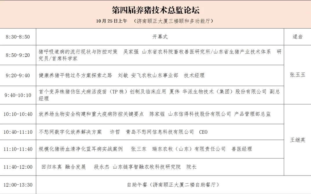 2、技术总监论坛(开放)。将邀请规模猪场的技术精英就猪场的成功运行的新技术、新模式、实战方案,特别是对于冬春季节的猪场管理、猪病防控等内容,现身说法,进行深入交流分享。